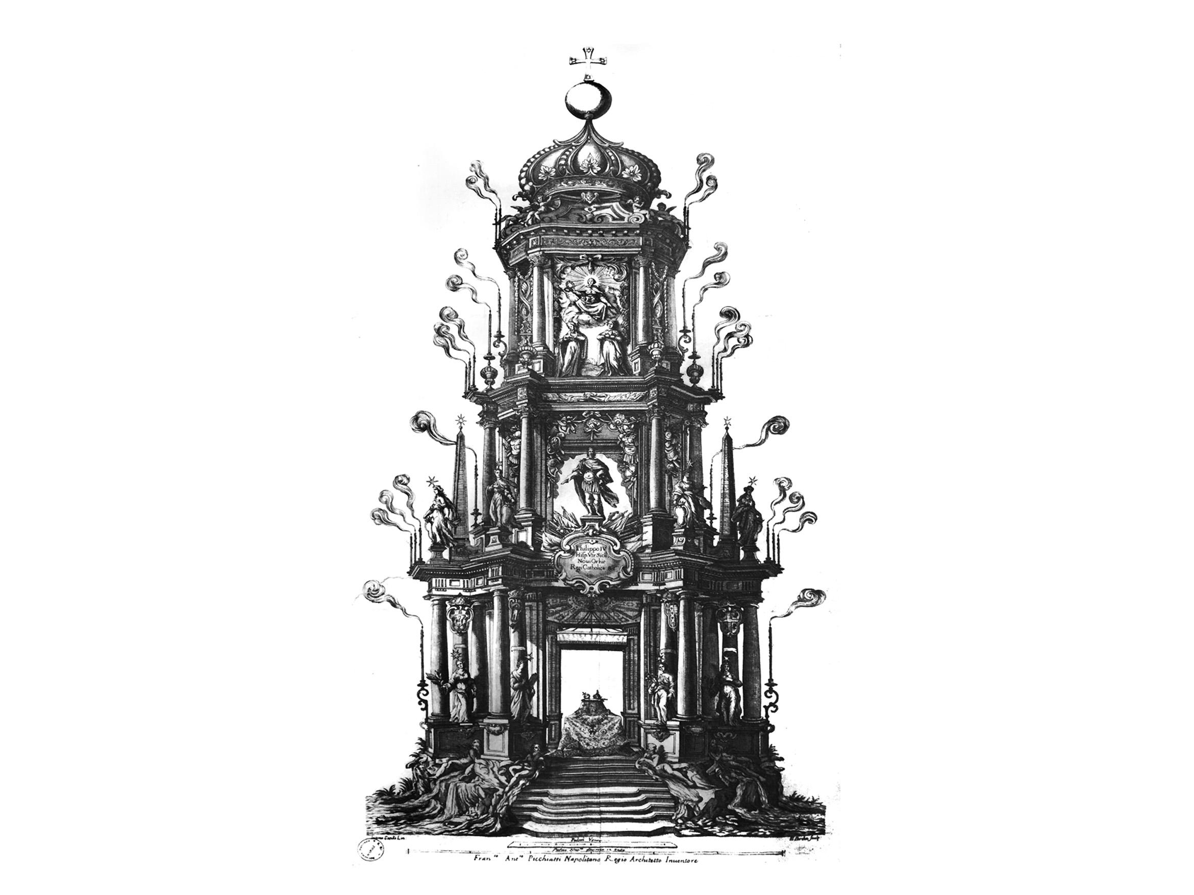 Los apparati funebri barrocos, del italiano apparecchio (“instrumento” o “conjunto”), eran una invención tipológica que adaptaban al lenguaje arquitectónico la pira funeraria de la antigüedad. A menudo cubiertos de velas, los catafalcos eran estructuras escalonadas con programas iconográficos, biográficos, alegóricos y míticos, fundamentados en símbolos terrenales que ascendían hacia lo divino en sus registros superiores.