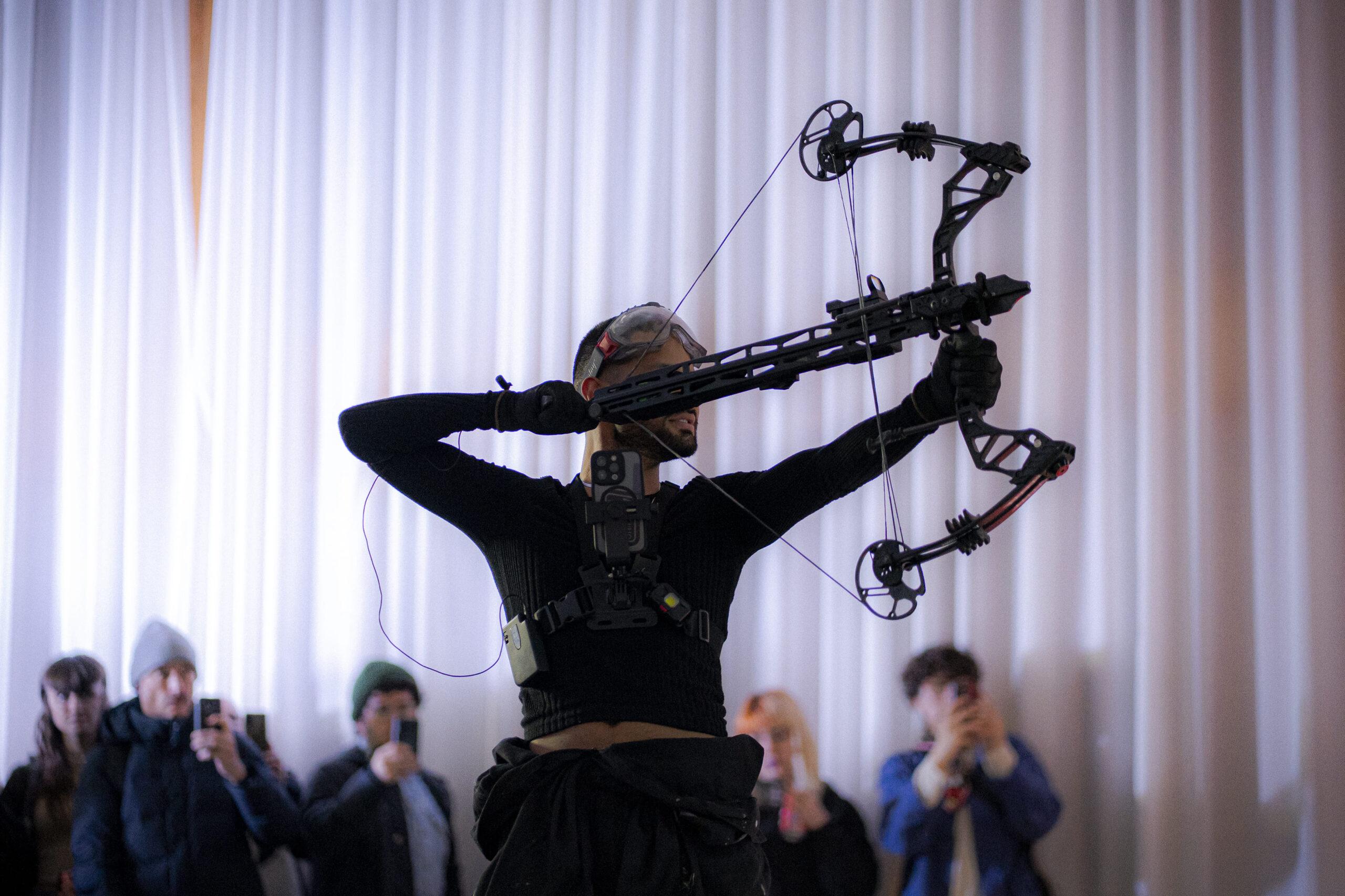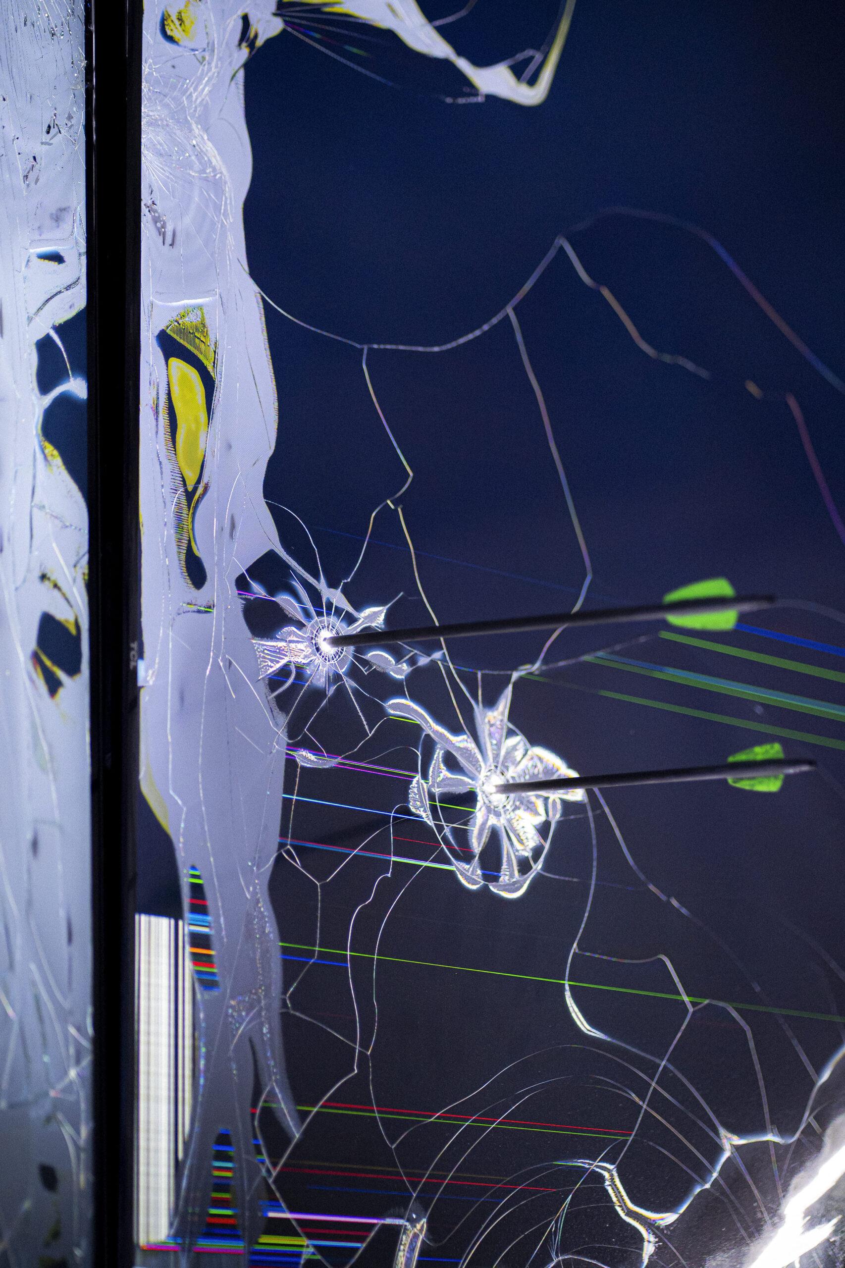 Aquí, el “like” deja de ser un gesto efímero para convertirse en un estado absoluto: un like total, que se desborda del espacio virtual y se materializa en el entorno físico. Las pantallas son atravesadas y transformadas, permaneciendo como cuerpos vulnerables, portadores de una energía post-digital. En esa acción performativa -Imagen Hunting- el gesto de disparar con un arco sobre las pantallas se convierte en un acto de liberación: una tentativa física de perforar la superficie perfecta de la imagen y devolverle su cuerpo.